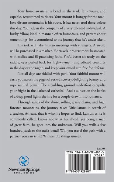 Your horse awaits at a bend in the trail. It is young and capable, accustomed to riders. Your mount is hungry for the road. Into distant mountains is his route. It has never trodden there before this day. You ride in the company of a very talented individual. A husky fellow, kind in manner, often humorous, and private about some things, he is committed to the journey that he's undertaken.His trek will take him to meetings with strangers. A sword will be purchased in a market. He travels into territories besmeared with malice and ill-practicing fools. You'd better sit ready on the saddle, eyes peeled back for highwaymen, unpredicted creatures in the day or the night, and keep your sword arm free for defense.Not all days are riddled with peril. Your faithful mount will carry you across the pages of eerie discovery, delighting beauty, and supernatural power. The trembling ground underfoot catapults your fright in the darkened cathedral. And a sunset on the banks of a deep pond lights the fire for a couple drawn into romance.Through sands of the shore, rolling grassy plains, and high forested mountains, the journey takes Riticulamus in search of a teacher. At least, that is what he hopes to find. Lamus, as he is commonly called, knows not what lies ahead, yet being a man of great faith, he goes into the unknown. Will you walk a few hundred yards to the trail's bend? Will you travel the path with a partner you can trust? Witness the things unseen.