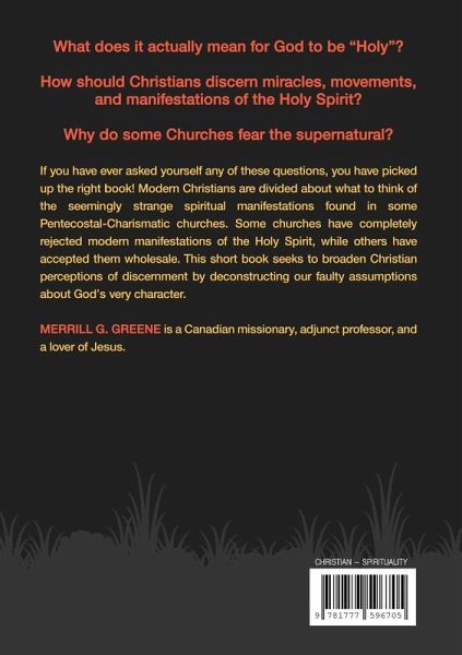 What does it actually mean for God to be "Holy"? How should Christians discern miracles, movements, and manifestations of the Holy Spirit? Why do some Churches fear the supernatural? If you have ever asked yourself any of these questions, you have picked up the right book! Modern Christians are divided about what to think of the seemingly strange spiritual manifestations found in some Pentecostal-Charismatic churches. Some churches have completely rejected modern manifestations of the Holy Spirit, while others have accepted them wholesale. This short book seeks to broaden Christian perceptions of discernment by deconstructing our faulty assumptions about God's very character. Author: Merrill G. Greene (PhD, McMaster University) is a Canadian missionary, adjunct professor, and a lover of Jesus.
