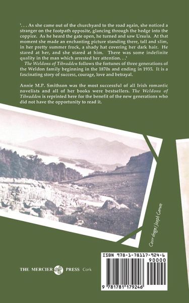 '...As she came out of the churchyard to the road again, she noticed a stranger on the footpath opposite, glancing through the hedge into the coppice. As he heard the gate open, he turned and saw Ursula. At that moment she made an enchanting picture standing there, tall and slim, in her pretty summer frock, a shady hat covering her dark hair. He stared at her, and she stared at him. There was some indefinite quality in the man which arrested her attention...' The Weldons of Tibradden follows the fortunes of three generations of the Weldon family beginning in the 1870s and ending in 1935. It is a fascinating story of success, courage, love and betrayal. Annie M.P. Smithson was the most successful of all Irish romantic novelists and all of her books were bestsellers. The Weldons of Tibradden is reprinted here for the benefit of the new generations who did not have the opportunity to read it.