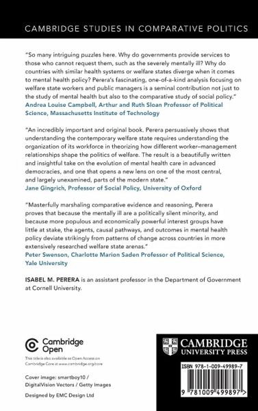 The Welfare Workforce is a thought-provoking exploration of mental health care in the United States and beyond. Although all the affluent democracies pursued deinstitutionalization, some failed to provide adequate services, while others overcame challenges of stigma and limited resources and successfully expanded care. Isabel M. Perera examines the role of the "welfare workforce" in providing social services to those who cannot demand them. Drawing on extensive research in four countries - the United States, France, Norway, and Sweden - Perera sheds light on post-industrial politics and the critical part played by those who work for the welfare state. A must-read for anyone interested in mental health care, social services, and the politics of welfare, The Welfare Workforce challenges conventional wisdom and offers new insights into the complex factors that contribute to the success or failure of mental health care systems. This title is also available as Open Access on Cambridge Core.