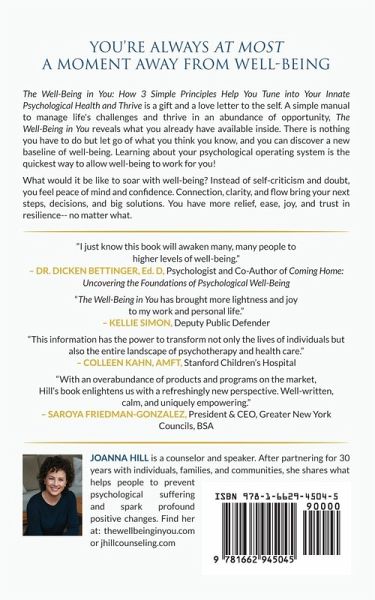 The Well-Being in You: How 3 Simple Principles Can Help You Tune into Your Innate Psychological Health and Thrive is a love letter and a simple manual to manage life's challenges and thrive in an abundance of opportunity. This book is a conversation that brings out what you already have inside. Personal and client stories and reflection questions give you ah ha moments, transforming how you feel day-to-day. By exploring well-being, you'll be able to experience it more deeply and often, and to know what gets in the way. We all struggle at times. We get overwhelmed by decisions or lost in what feel like bigger problems. Whether you can't shake a sense of fear, worry, anxiety or depression; or you simply want to feel better about your relationships, work, and the world, this book is your companion and guide to deeper peace-of-mind, energy, and clarity. And it doesn't require what you might think. The Well-Being in You explains that there's nothing you have to do but let go of what you think you know, and you can find a new baseline of well-being. Realizing that you have a psychological operating system is the quickest way to allow well-being to work for you! You will learn to: Know what well-being really is Notice you already have well-being and trust it in yourself and others Get out of your own way Use your thinking (intellect and intuition) effectively, befriend feelings, and be mindful of moods Ease into motivation, purpose, and flow How does having a new baseline of well-being feel? People are in awe of how different and limitless they can feel. For example, you'll notice a sense of relief, calm, and okay-ness. Self-compassion and confidence become your springboard for tasks and life changes. Flow brings just-right ideas, empowering insights, and clear next steps for decisions and challenges. Resilience, worthiness, and connection-even if they previously felt impossible to achieve, are naturally yours. Your own bliss and genius lead the journey- for your benefit and the world's. YOU ARE ALWAYS (at most) A MOMENT AWAY FROM WELL-BEING- no matter what. Well-being is yours to tap into. You just need to know how it works.