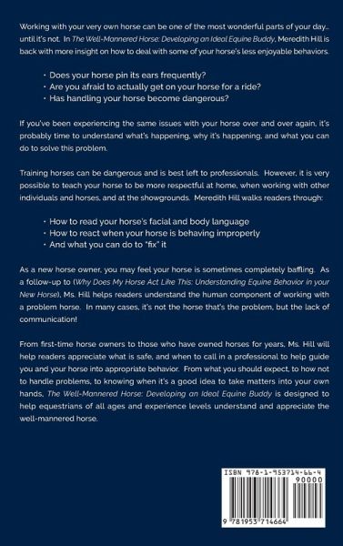 Working with your very own horse can be one of the most wonderful parts of your day... until it's not. In The Well-Mannered Horse: Developing an Ideal Equine Buddy, Meredith Hill is back with more insight on how to deal with some of your horse's less enjoyable behaviors. ¿ Does your horse pin its ears frequently? ¿ Are you afraid to actually get on your horse for a ride? ¿ Has handling your horse become dangerous? If you've been experiencing the same issues with your horse over and over again, it's probably time to understand what's happening, why it's happening, and what you can do to solve this problem. Training horses can be dangerous and is best left to professionals. However, it is very possible to teach your horse to be more respectful at home, when working with other individuals and horses, and at the showgrounds. Meredith Hill walks readers through: ¿ How to read your horse's facial and body language ¿ How to react when your horse is behaving improperly ¿And what you can do to "fix" it As a new horse owner, you may feel your horse is sometimes completely baffling. As a follow-up to (Why Does My Horse Act Like This: Understanding Equine Behavior in your New Horse), Ms. Hill helps readers understand the human component of working with a problem horse. In many cases, it's not the horse that's the problem, but the lack of communication! From first-time horse owners to those who have owned horses for years, Ms. Hill will help readers appreciate what is safe, and when to call in a professional to help guide you and your horse into appropriate behavior. From what you should expect, to how not to handle problems, to knowing when it's a good idea to take matters into your own hands, The Well-Mannered Horse: Developing an Ideal Equine Buddy is designed to help equestrians of all ages and experience levels understand and appreciate the well-mannered horse. Pick up your copy today by clicking the BUY NOW button at the top of this page!