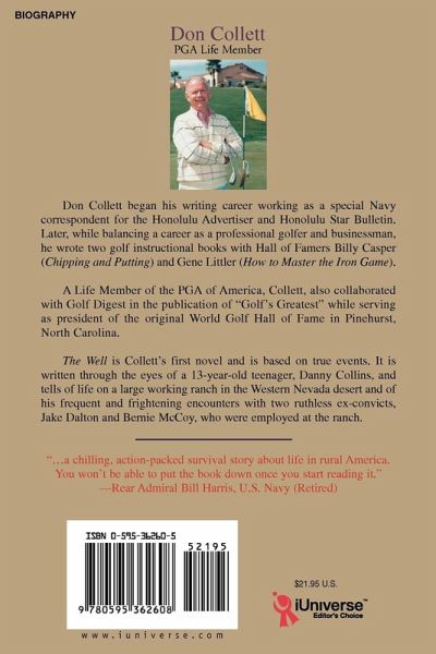 Don Collett began his writing career working as a special Navy correspondent for the Honolulu Advertiser and Honolulu Star Bulletin. Later, while balancing a career as a professional golfer and businessman, he wrote two golf instructional books with Hall of Famers Billy Casper (Chipping and Putting) and Gene Littler (How to Master the Iron Game). A Life Member of the PGA of America, Collett, also collaborated with Golf Digest in the publication of 'Hall of Famers in Action" while serving as president of the original World Golf Hall of Fame in Pinehurst, North Carolina. The Well is Collett's first novel and is based on true events. It is written through the eyes of a 13-year-old teenager, Danny Collins, and tells of life on a large working ranch in the Western Nevada desert and of his frequent and frightening encounters with two ruthless ex-convicts, Jake Dalton and Bernie McCoy, who were employed at the ranch. ------------ '...a chilling, action-packed survival story about life in rural America. You won't be able to put the book down once you start reading it." -Rear Admiral Bill Harris, U.S. Navy (Retired)