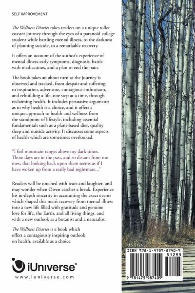 The Wellness Diaries takes readers on a unique roller coaster journey through the eyes of a paranoid college student while battling mental illness, to the darkness of planning suicide, to a remarkable recovery. It offers an account of the author's experience of mental illness-early symptoms, diagnosis, battle with medications, and a plan to end the pain. The book takes an about turn as the journey is observed and tracked, from despair and suffering, to inspiration, adventure, contagious enthusiasm, and rebuilding a life, one step at a time, through reclaiming health. It includes persuasive arguments as to why health is a choice, and it offers a unique approach to health and wellness from the standpoint of lifestyle, including essential fundamentals such as a plant-based diet, quality sleep and outside activity. It discusses some aspects of health which are sometimes overlooked. "I feel mountain ranges above my dark times. Those days are in the past, and so distant from me now, that looking back upon them seems as if I have woken up from a really bad nightmare..." Readers will be touched with tears and laughter, and may wonder when Owen catches a break. Experience his in-depth sincerity in accounting the exact events which shaped this man's recovery from mental illness into a new life filled with gratitude and genuine love for life, the Earth, and all living things, and with a new outlook as a botanist and a naturalist. The Wellness Diaries is a book which offers a contagiously inspiring outlook on health, available as a choice.
