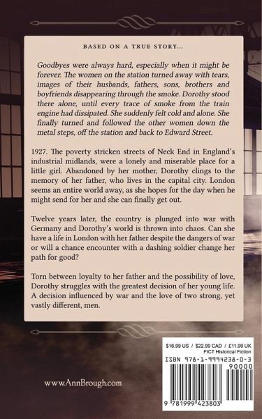 Based on a true story… Goodbyes were always hard, especially when it might be forever. The women on the station turned away with tears, images of their husbands, fathers, sons, brothers and boyfriends disappearing through the smoke. Dorothy stood there alone, until every trace of smoke from the train engine had dissipated. She suddenly felt cold and alone. She finally turned and followed the other women down the metal steps, off the station and back to Edward Street. 1927. The poverty-stricken streets of Neck End in England's industrial Midlands, were a lonely and miserable place for a little girl. Abandoned by her mother, Dorothy clings to the memory of her father, who lives in the capital city. London seems an entire world away, as she hopes for the day when he might send for her and she can finally get out. Twelve years later, the country is plunged into war with Germany and Dorothy's world is thrown into chaos. Can she have a life in London with her father despite the dangers of war or will a chance encounter with a dashing soldier change her path for good? Torn between loyalty to her father and the possibility of love, Dorothy struggles with the greatest decision of her young life. A decision influenced by war and the love of two strong, yet vastly different, men.