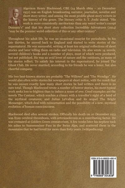 Algernon Henry Blackwood, CBE (14 March 1869 - 10 December 1951) was an English broadcasting narrator, journalist, novelist and short story writer, and among the most prolific ghost story writers in the history of the genre. The literary critic S. T. Joshi stated, "His work is more consistently meritorious than any weird writer's except Dunsany's" and that his short story collection Incredible Adventures (1914) "may be the premier weird collection of this or any other century". Throughout his adult life, he was an occasional essayist for periodicals. In his late thirties, he moved back to England and started to write stories of the supernatural. He was successful, writing at least ten original collections of short stories and later telling them on radio and television. He also wrote 14 novels, several children's books and a number of plays, most of which were produced, but not published. He was an avid lover of nature and the outdoors, as many of his stories reflect. To satisfy his interest in the supernatural, he joined The Ghost Club. He never married; according to his friends he was a loner, but also cheerful company. His two best-known stories are probably "The Willows" and "The Wendigo". He would also often write stories for newspapers at short notice, with the result that he was unsure exactly how many short stories he had written and there is no sure total. Though Blackwood wrote a number of horror stories, his most typical work seeks less to frighten than to induce a sense of awe. Good examples are the novels The Centaur, which reaches a climax with a traveller's sight of a herd of the mythical creatures; and Julius LeVallon and its sequel The Bright Messenger, which deal with reincarnation and the possibility of a new, mystical evolution of human consciousness. Blackwood died after several strokes. Officially his death on 10 December 1951 was from cerebral thrombosis, with arteriosclerosis as a contributing factor. He was cremated at Golders Green crematorium. A few weeks later his nephew took his ashes to Saanenmöser Pass in the Swiss Alps, and scattered them in the mountains that he had loved for more than forty years. (wikipedia.org)