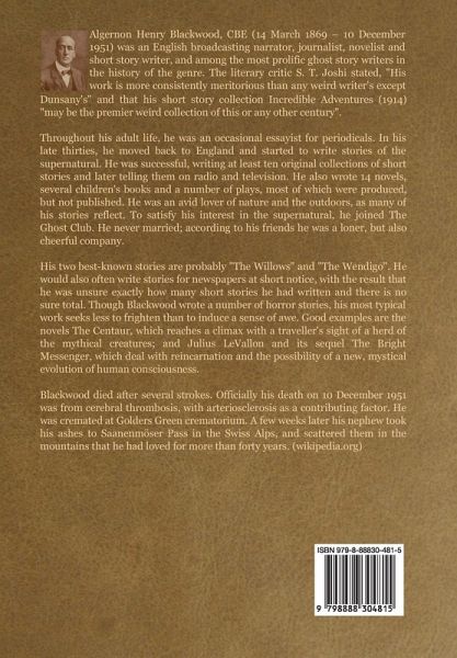 Algernon Henry Blackwood, CBE (14 March 1869 - 10 December 1951) was an English broadcasting narrator, journalist, novelist and short story writer, and among the most prolific ghost story writers in the history of the genre. The literary critic S. T. Joshi stated, "His work is more consistently meritorious than any weird writer's except Dunsany's" and that his short story collection Incredible Adventures (1914) "may be the premier weird collection of this or any other century". Throughout his adult life, he was an occasional essayist for periodicals. In his late thirties, he moved back to England and started to write stories of the supernatural. He was successful, writing at least ten original collections of short stories and later telling them on radio and television. He also wrote 14 novels, several children's books and a number of plays, most of which were produced, but not published. He was an avid lover of nature and the outdoors, as many of his stories reflect. To satisfy his interest in the supernatural, he joined The Ghost Club. He never married; according to his friends he was a loner, but also cheerful company. His two best-known stories are probably "The Willows" and "The Wendigo". He would also often write stories for newspapers at short notice, with the result that he was unsure exactly how many short stories he had written and there is no sure total. Though Blackwood wrote a number of horror stories, his most typical work seeks less to frighten than to induce a sense of awe. Good examples are the novels The Centaur, which reaches a climax with a traveller's sight of a herd of the mythical creatures; and Julius LeVallon and its sequel The Bright Messenger, which deal with reincarnation and the possibility of a new, mystical evolution of human consciousness. Blackwood died after several strokes. Officially his death on 10 December 1951 was from cerebral thrombosis, with arteriosclerosis as a contributing factor. He was cremated at Golders Green crematorium. A few weeks later his nephew took his ashes to Saanenmöser Pass in the Swiss Alps, and scattered them in the mountains that he had loved for more than forty years. (wikipedia.org)