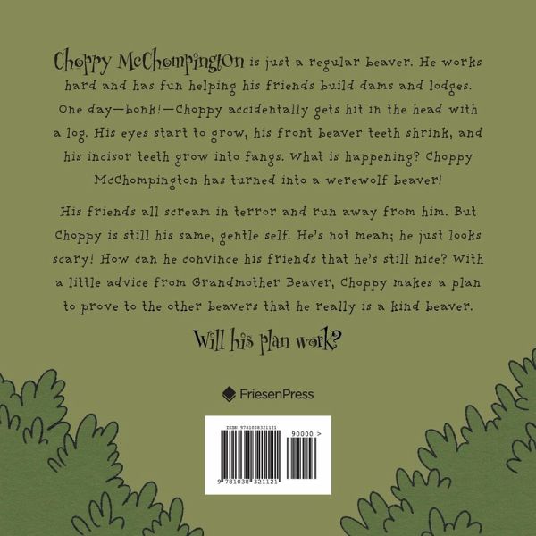 Choppy McChompington is just a regular beaver. He works hard and has fun helping his friends build dams and lodges. One day-bonk!-Choppy accidentally gets hit in the head with a log. His eyes start to grow, his front beaver teeth shrink, and his incisor teeth grow into fangs. What is happening? Choppy McChompington has turned into a werewolf beaver! His friends all scream in terror and run away from him. But Choppy is still his same, gentle self. He's not mean; he just looks scary! How can he convince his friends that he's still nice? With a little advice from Grandmother Beaver, Choppy makes a plan to prove to the other beavers that he really is a kind beaver. Will his plan work?