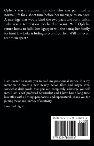 Ophelia was a stubborn princess who was permitted a normal life for a short time before her marriage to stranger. A marriage that would bind the two pacts and form unity. Luke was a temptation too hard to resist. Will Ophelia return home to fulfill her legacy or will she betray her family for him? But Luke is hiding a secret from her. Will his secret tear them apart?