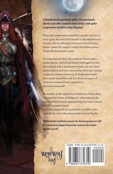 Darla is a Brotherhood operative with a haunted past. She is an elite assassin and thief, with quite a repertoire of skills at her disposal. When she accepts what seems like a simple contract to steal a gem, she soon finds herself in an adventure of a lifetime. The so-called gem turns out to be a Divinity Stone, a: powerful, magical artefact that the demon prince Malgorath desperately wants. Pitted against unbelievable odds, battling against fanatical elves, extraordinary beasts and a hunter demon, Darla finds herself challenged at every turn. Armed with a sacred short sword and fighting for her very survival, Darla uses sheer determination and every ounce of her fortitude, vowing to keep the Divinity Stone out of Malgorath's hands. It is a daunting task, near impossible, but there is an aspect of Darla that her enemies haven't counted on --- she is also a werewolf! Meanwhile, in the capital city of Sethanon, Prince Zane of the royal Everthorn family is plagued by visions of Magorath as the demon prince torments them, manipulating the events around him like a puppet master. Coming to the realization that Malgorath is indeed a member of the royal family, Zane decides to take matters into his own hands. Will Zane have the strength to go through with it or will Malgorath continue to manipulate things to his own agenda and put the whole world in peril. An action packed dark fantasy novel, perfect for people who love a fast-paced adventure! *Warning - This novel is for a young adult / adult audience as it contains some explicit language and descriptive gore.
