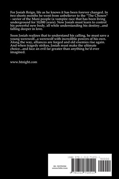 For Josiah Reign, life as he knows it has been forever changed. In two shorts months he went from unbeliever to the "The Chosen" - savior of the Mani people (a vampire race that has been living underground for 10,000 years). Now Josiah must learn to control his powerful new body, all while understanding his destiny...and falling deeper in love. Soon Josiah realizes that to understand his calling, he must save a young werewolf...a werewolf with incredible powers of his own. Along the way, alliances are forged and old enemies rise again. And when tragedy strikes, Josiah must make the ultimate choice...and face an evil far greater than anything he'd ever imagined.