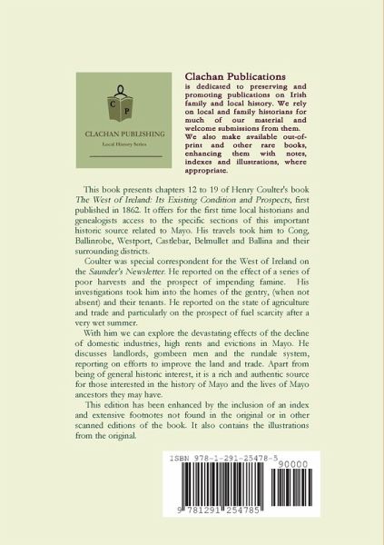 Here are presented the eight chapters relating to County Mayo of Henry Coulter book 'The West of Ireland: Its Existing Condition and Prospects', first published in 1862. It offers local historians and genealogists access to this important historic source related to Cong, Ballinrobe, Westport, Castlebar, Belmullet and Ballina and the surrounding districts of Mayo. It reports on poor harvests and the prospect of impending famine and state of agriculture and trade. It gives a contemporary account of landlords, gombeen men, high rents and evictions. It is a rich and authentic source for those interested in the history of Mayo and the lives and circumstances of any Mayo ancestors they may have. This edition has been enhanced by the inclusion of an index and extensive footnotes not found in the original or in other scanned editions of the book.