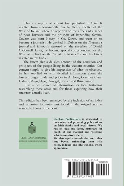 Clachan Publishers in reprinting this 150 year old book has made a print copy available of Henry Coulters first-hand account of the condition and prospects of the people living in the western counties of Ireland in 1862. Coulter was a special correspondent for the Saunder's Newsletter who was not content simply to give general impressions of what he observed, but has supplied us with detailed information about the harvest, wages, trade and prices in Athlone, Counties Clare, Galway, Mayo, Sligo, Donegal, Leitrim and Roscommon. This carefully researched edition supplies us with footnotes and an index not available in the original, making it a rich source of information for those interested in the local histories of these areas and for those exploring how their ancestors actually lived.