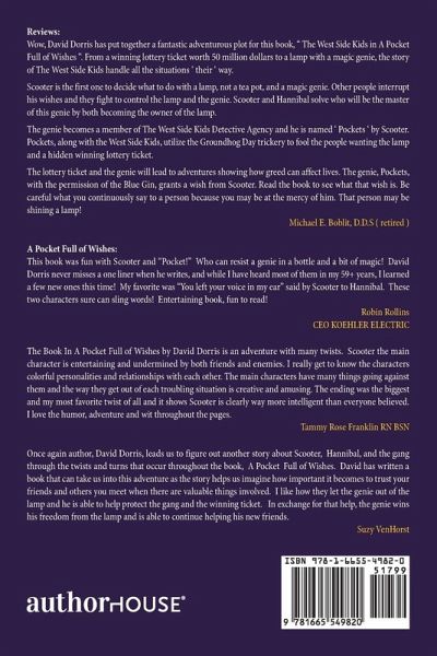 A Pocket Full of Wishes: This book was fun with Scooter and "Pocket!" Who can resist a genie in a bottle and a bit of magic! David Dorris never misses a one liner when he writes, and while I have heard most of them in my 59+ years, I learned a few new ones this time! My favorite was "You left your voice in my ear" said by Scooter to Hannibal. These two characters sure can sling words! Entertaining book, fun to read! Robin Rollins CEO KOEHLER ELECTRIC