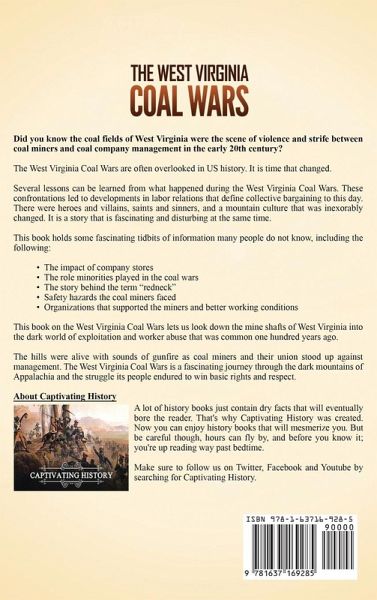 Did you know the coal fields of West Virginia were the scene of violence and strife between coal miners and coal company management in the early 20th century? The West Virginia Coal Wars are often overlooked in US history. It is time that changed. Several lessons can be learned from what happened during the West Virginia Coal Wars. These confrontations led to developments in labor relations that define collective bargaining to this day. There were heroes and villains, saints and sinners, and a mountain culture that was inexorably changed. It is a story that is fascinating and disturbing at the same time. This book holds some fascinating tidbits of information many people do not know, including the following: The impact of company stores The role minorities played in the coal wars The story behind the term "redneck" Safety hazards the coal miners faced Organizations that supported the miners and better working conditions This book on the West Virginia Coal Wars lets us look down the mine shafts of West Virginia into the dark world of exploitation and worker abuse that was common one hundred years ago. The hills were alive with sounds of gunfire as coal miners and their union stood up against management. The West Virginia Coal Wars is a fascinating journey through the dark mountains of Appalachia and the struggle its people endured to win basic rights and respect.