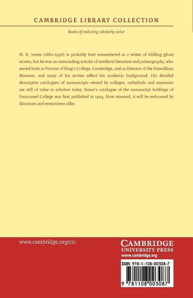M. R. James' much-sought-after descriptive catalogue of the manuscript collection in Emmanuel College, Cambridge.