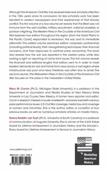 Mary M. Cronin, Debra Reddin van Tuyll, and Bill Huntzicker: Introduction: Land. Lots of Land. And Newspapers, Too: Westward Migration and the Creation of Western Journalism - Debra Reddin van Tuyll: By the Numbers: Facts and Figures of Western Editors and Their Newspapers - Mary M. Cronin: "Give Us the War News!": News Gathering, Distribution, and Audiences - Glen Feighery and David J. Vergobbi: Press Roles and Functions: Community Building in the West - Erika J. Pribanic- Smith: No 'Cliques or Factions': Politics, Partisanship and the Press in the West - Crompton Burton: "Stirring Times": The Coming of the American Civil War in the Western Press - Mary M. Cronin: Acts of Disloyalty: Legal and Extralegal Restrictions on the Far Western Press in Wartime - Hubert van Tuyll: A Distant and Bloody Mirror: The Western Press and the Fighting - Jennifer E. Moore: From Sea to Shining Sea: Domestic and International News from the Plains to the Ocean - Katrina Quinn: "Words are Not Sufficient": The Western Press Reports the End of the War and the Death of Lincoln - Mary M. Cronin and Debra Reddin van Tuyll: Epilogue: In the Final Analysis: A Region of High- Risk Opportunity - Index.