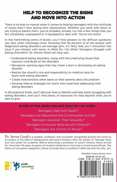 "There is no how-to manual when it comes to helping teenagers with the multitude of issues they'll face during their adolescence. Whether you work with teens or are trying to parent them, you've probably already run into a few things that you felt completely unprepared or ill equipped to deal with. You are not alone! In this hard-hitting series of books, you'll find answers to the difficult questions you face when challenges arise. Knowing that ninety-five percent of all the people with diagnosed eating disorders are teenage girls, it's likely that you'll encounter this issue if you interact with teens. In What Do I Do When Teenagers Struggle with Eating Disorders?, Dr. Steven Gerali will help you: - Understand eating disorders, along with the underlying issues that typically contribute to the disorders - Recognize warning signs that may mean a teen is developing an eating disorder - Realize the role and responsibility the Church has to mobilize help for teens with eating disorders - Create interventions when teens or their parents deny the problem - Develop a referral strategy for teens who need help addressing their eating disorder In this practical book, you'll discover how to identify and help a teen who is struggling with an eating disorder, and you'll find plenty of resources for help beyond what you're able to give."