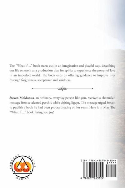 The "What if..." book starts out in an imaginative and playful way, describing our life on earth as a production play for spirits to experience the power of love in an imperfect world. The book ends by offering guidance to improve lives through forgiveness, acceptance and kindness.