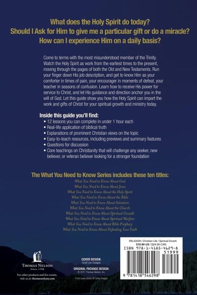 What does the Holy Spirit do today? Should I ask for Him to give me a particular gift or do a miracle? How can I experience Him on a daily basis? Come to terms with the most misunderstood member of the Trinity. In twelve lessons for individual or small group study, you will watch the Holy Spirit at work from the earliest times to the present, moving through the pages of both the Old and New Testaments. You will get to know Him as your comforter in times of pain, your encourager in moments of defeat, and your teacher in times of confusion. And, finally, you will learn how to receive His power for service to Christ and let His guidance and direction anchor them in the will of God. The What You Need to Know Series includes these ten titles: What You Need to Know about God What You Need to Know about Jesus What You Need to Know about the Holy Spirit What You Need to Know about the Bible What You Need to Know about Salvation What You Need to Know about the Church What You Need to Know about Spiritual Growth What You Need to Know about Spiritual Warfare What You Need to Know about Bible Prophecy What You Need to Know about Defending Your Faith