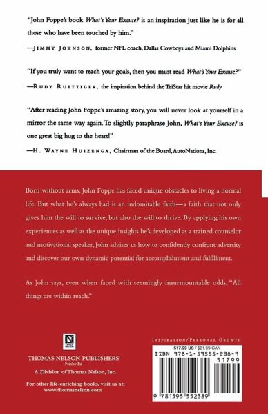 In this positive and practical memoir, John Foppe learns how to not only survive amidst insurmountable odds, but live a full life and inspire others to do the same. Born without arms, John has faced unique obstacles to living a normal life. But what he's always had is an indomitable faith?a faith that not only gives him the will to survive, but also the will to thrive. With a foreword by Zig Ziglar, John asks the reader hard questions and applies his own experiences as well as the unique insights he's developed. As a trained counselor and motivational speaker, John advises us how to: confidently confront adversity discover our own dynamic potential achieve accomplishment and fulfillment. As John says, even when faced with seemingly insurmountable odds, "All things are within reach." "John Foppe's book What's Your Excuse? is an inspiration just like he is for all those who have been touched by him." ?Jimmy Johnson, former NFL coach, Dallas Cowboys and Miami Dolphins "If you truly want to reach your goals, then you must read What's Your Excuse?" ?Rudy Ruettiger, the inspiration behind the TriStar hit movie Rudy "Every one of us has survived some type of tragedy. John's story and practical insights help all of us to overcome the challenges in our lives. What's Your Excuse? is not just an inspirational book but a definitive 'how to' guide for triumphing over our problems." ?Dav Pelzer, number one international bestselling author of A Child Called It and Help Yourself