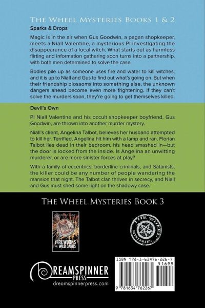 The Wheel MysteriesBooks 1 & 2 Sparks & Drops Magic is in the air when Gus Goodwin, a pagan shopkeeper, meets a Niall Valentine, a mysterious PI investigating the disappearance of a local witch. What starts out as harmless flirting and information gathering soon turns into a partnership, with both men determined to solve the case. Bodies pile up as someone uses fire and water to kill witches, and it is up to Niall and Gus to find out what's going on. But when their friendship blossoms into something else, the unknown dangers ahead become even more frightening. If they can't solve the murders soon, they're going to get themselves killed. Devil's Own PI Niall Valentine and his occult shopkeeper boyfriend, Gus Goodwin, are thrown into another murder mystery. Niall's client, Angelina Talbot, believes her husband attempted to kill her. Terrified, Angelina hit him with a lamp and ran. Florian Talbot lies dead in their bedroom, his head smashed in-but the door is locked from the inside. Is Angelina an unwitting murderer, or are more sinister forces at play? With a family of eccentrics, borderline criminals, and Satanists, the killer could be any number of people wandering the mansion that night. The Talbot clan thrives in secrecy, and Niall and Gus must shed some light on the shadowy case.