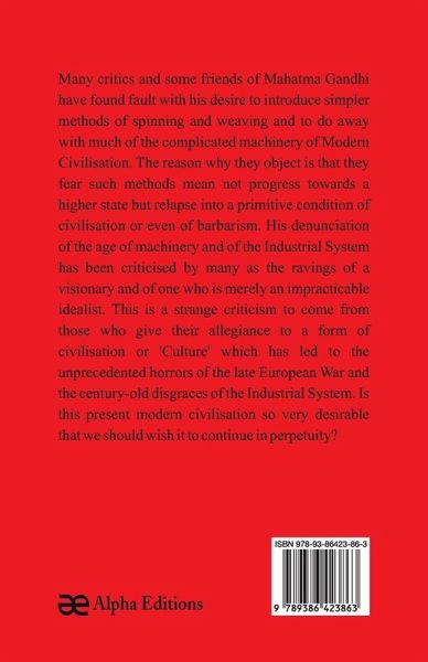 Many critics and some friends of Mahatma Gandhi have found fault with his desire to introduce simpler methods of spinning and weaving and to do away with much of the complicated machinery of Modern Civilisation. The reason why they object is that they fear such methods mean not progress towards a higher state but relapse into a primitive condition of civilisation or even of barbarism. His denunciation of the age of machinery and of the Industrial System has been criticised by many as the ravings of a visionary and of one who is merely an impracticable idealist. This is a strange criticism to come from those who give their allegiance to a form of civilisation or 'Culture' which has led to the unprecedented horrors of the late European War and the century-old disgraces [pg x] of the Industrial System. Is this present modern civilisation so very desirable that we should wish it to continue in perpetuity?