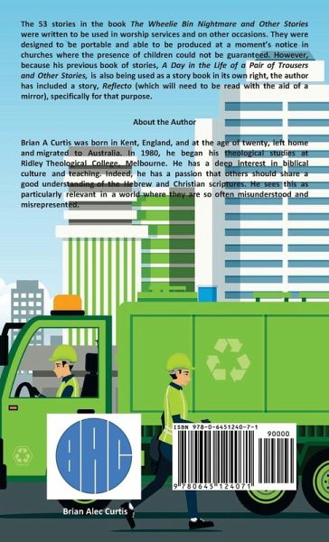 The 53 stories in the book The Wheelie Bin Nightmare and Other Stories were written to be used in worship services and on other occasions. They were designed to be portable and able to be produced at a moment's notice in churches where the presence of children could not be guaranteed. Because his previous book of stories, A Day in the Life of a Pair of Trousers and Other Stories, is also being used as a story book in its own right, the author has included a story, Reflecto (which will need to be read with the aid of a mirror), specifically for that purpose.