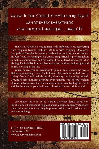 What if the Gnostic myth were true? What every everything you thought was real...wasn't? Seth St. John is a young man with problems: He is recovering from religious trauma that has left him with crippling Obsessive-Compulsive Disorder, he works a dead-end job and lives on top ramen, his best friend is crashing on his couch, his girlfriend is pressuring him to make a commitment, and his landlord has ordered him to get rid of his dog. He feels like he's on a hamster wheel, with no end in sight and no real meaning in his life. When he receives an invitation to join a secret society, he sees a lifeline to something...more. But he has no idea just how much the secret society's "secrets" will make his world, his reality, and his sanity unravel. Grounded in the universe described by the gnostic text The Apocryphon of John, Seth discovers that there are dark powers controlling his world, and that he and everyone he knows is hurtling toward a sinister end... The Where, the Who & the What is a science fiction novel, yes. But it is also a book about religious abuse, about annoyingly stubborn friendships, and about resisting the powers inside us and outside us that seek our undoing.