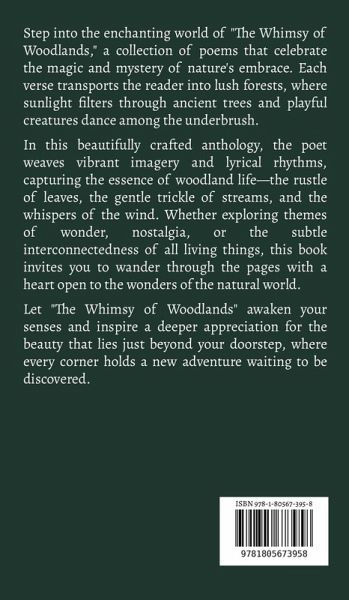 Step into the enchanting world of "The Whimsy of Woodlands," a collection of poems that celebrate the magic and mystery of nature's embrace. Each verse transports the reader into lush forests, where sunlight filters through ancient trees and playful creatures dance among the underbrush. In this beautifully crafted anthology, the poet weaves vibrant imagery and lyrical rhythms, capturing the essence of woodland life-the rustle of leaves, the gentle trickle of streams, and the whispers of the wind. Whether exploring themes of wonder, nostalgia, or the subtle interconnectedness of all living things, this book invites you to wander through the pages with a heart open to the wonders of the natural world. Let "The Whimsy of Woodlands" awaken your senses and inspire a deeper appreciation for the beauty that lies just beyond your doorstep, where every corner holds a new adventure waiting to be discovered.