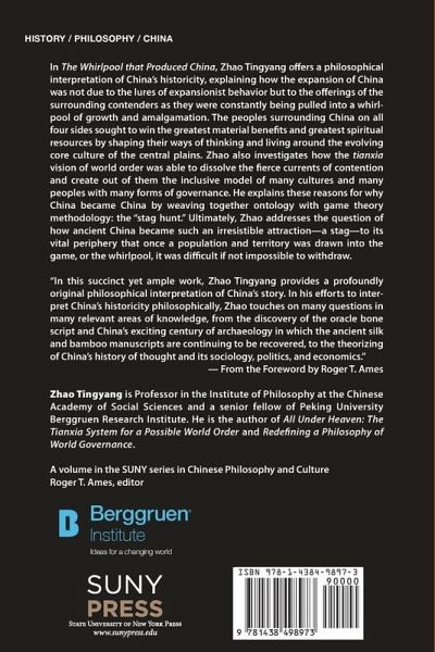 Provides a philosophical, cultural, and historical answer to the question: Where did China come from? In The Whirlpool That Produced China, Tingyang Zhao offers a philosophical interpretation of China's historicity, explaining how the expansion of China was not due to the lures of expansionist behavior but to the offerings of the surrounding contenders as they were constantly being pulled into a whirlpool of growth and amalgamation. The peoples surrounding China on all four sides sought to win the greatest material benefits and greatest spiritual resources by shaping their ways of thinking and living around the evolving core culture of the central plains. Zhao also investigates how the tianxia vision of world order was able to dissolve the fierce currents of contention and create out of them the inclusive model of many cultures and many peoples with many forms of governance. He explains these reasons for why China became China by weaving together ontology with game theory methodology: the "stag hunt." Ultimately, Zhao addresses the question of how ancient China became such an irresistible attraction-a stag-to its vital periphery that once a population and territory was drawn into the game, or the whirlpool, it was difficult if not impossible to withdraw.
