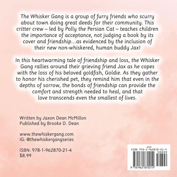 The Whisker Gang is a group of furry friends who scurry about town doing great deeds for their community. This critter crew - led by Polly the Persian Cat - teaches children the importance of acceptance, not judging a book by its cover and friendship...as evidenced by the inclusion of their new non-whiskered, human buddy Jax! In this heartwarming tale of friendship and loss, the Whisker Gang rallies around their grieving friend Jax as he copes with the loss of his beloved goldfish, Goldie. As they gather to honor his cherished pet, they remind him that even in the depths of sorrow, the bonds of friendship can provide the comfort and strength needed to heal, and that love transcends even the smallest of lives.