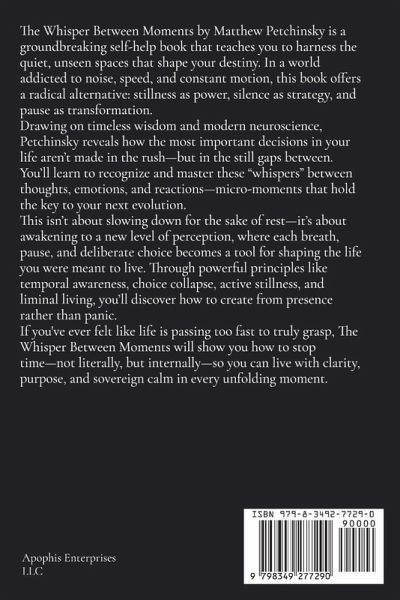 The Whisper Between Moments by Matthew Petchinsky is a groundbreaking self-help book that teaches you to harness the quiet, unseen spaces that shape your destiny. In a world addicted to noise, speed, and constant motion, this book offers a radical alternative: stillness as power, silence as strategy, and pause as transformation. Drawing on timeless wisdom and modern neuroscience, Petchinsky reveals how the most important decisions in your life aren't made in the rush-but in the still gaps between. You'll learn to recognize and master these "whispers" between thoughts, emotions, and reactions-micro-moments that hold the key to your next evolution. This isn't about slowing down for the sake of rest-it's about awakening to a new level of perception, where each breath, pause, and deliberate choice becomes a tool for shaping the life you were meant to live. Through powerful principles like temporal awareness, choice collapse, active stillness, and liminal living, you'll discover how to create from presence rather than panic. If you've ever felt like life is passing too fast to truly grasp, The Whisper Between Moments will show you how to stop time-not literally, but internally-so you can live with clarity, purpose, and sovereign calm in every unfolding moment.