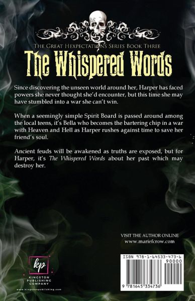 Since discovering the unseen world around her, Harper has faced powers she never thought she'd encounter, but this time she may have stumbled into a war she can't win. When a seemingly simple Spirit Board is passed around among the local teens, it's Bella who becomes the bartering chip in a war with Heaven and Hell as Harper rushes against time to save her friend's soul. Ancient feuds will be awakened as truths are exposed, but for Harper, it's The Whispered Words about her past which may destroy her.