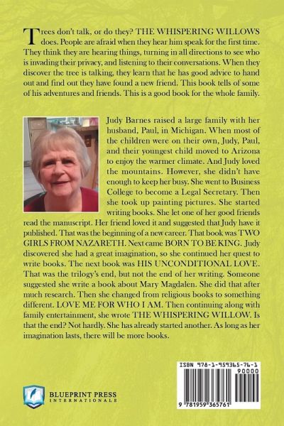 Trees don't talk, or do they? THE WHISPERING WILLOWS does. People are afraid when they hear him speak for the first time. They think they are hearing things, turning in all directions to see who is invading their privacy, and listening to their conversations. When they discover the tree is talking, they learn that he has good advice to hand out and find out they have found a new friend. This book tells of some of his adventures and friends. This is a good book for the whole family. Judy Barnes raised a large family with her husband, Paul, in Michigan. When most of the children were on their own, Judy, Paul, and their youngest child moved to Arizona to enjoy the warmer climate. And Judy loved the mountains. However, she didn't have enough to keep her busy. She went to Business College to become a Legal Secretary. Then she took up painting pictures. She started writing books. She let one of her good friends read the manuscript. Her friend loved it and suggested that Judy have it published. That was the beginning of a new career. That book was TWO GIRLS FROM NAZARETH. Next came BORN TO BE KING. Judy discovered she had a great imagination, so she continued her quest to write books. The next book was HIS UNCONDITIONAL LOVE. That was the trilogy's end, but not the end of her writing. Someone suggested she write a book about Mary Magdalen. She did that after much research. Then she changed from religious books to something different. LOVE ME FOR WHO I AM. Then continuing along with family entertainment, she wrote THE WHISPERING WILLOW. Is that the end? Not hardly. She has already started another. As long as her imagination lasts, there will be more books.