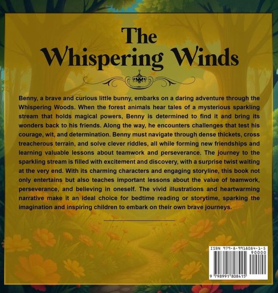 Embark on a thrilling adventure with "The Whispering Wind," the latest addition to the Benny's Brave Adventures series by the imaginative Hong Z. McCormick. In this enchanting tale, Benny the Rabbit, alongside his loyal friends Molly the Mouse and Charlie the Chipmunk, finds himself caught in a mysterious windstorm that sweeps them into the depths of the unknown. This storm is no ordinary tempest, but a harbinger of ancient spells and secrets that disrupt the natural harmony of their forest home. Set in the mystical Whispering Woods, this captivating story unfolds as Benny stumbles upon strange clues and signs of trouble that hint at a larger, hidden magic at work. Determined to uncover the truth and restore balance, Benny and his friends embark on an epic quest filled with challenges that test their bravery and ingenuity. They encounter a host of mystical relics such as the Echoing Shell, Luminous Feather, and Crystal Leaf, each with its own unique power and story. As they delve deeper into the forest's mysteries, they chant ancient spells and meet ethereal forest spirits who offer their guidance and wisdom. Each encounter is filled with excitement and danger, pushing the trio to think creatively and rely on their strong bonds of friendship to overcome obstacles. This story is a celebration of the timeless magic of friendship and the strength found in unity. Readers of all ages will be drawn into a world brimming with adventure and wonder, where courage and camaraderie ultimately triumph over adversity. Join Benny, Molly, and Charlie as they navigate through enchanting landscapes, unravel the mysteries of the past, and fight to ensure the survival of their cherished home in "The Whispering Wind."