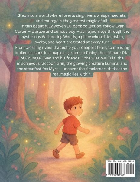 Step into a world where forests sing, rivers whisper secrets, and courage is the greatest magic of all! In this beautifully woven 10-book collection, follow Evan Carter - a brave and curious boy - as he journeys through the mysterious Whispering Woods, a place where friendship, loyalty, and heart are tested at every turn. From crossing rivers that echo your deepest fears, to mending broken seasons in a magical garden, to facing the ultimate Trial of Courage, Evan and his friends - the wise owl Tula, the mischievous raccoon Grin, the glowing creature Lumina, and the steadfast fox Myrr - uncover the timeless truth that the real magic lies within. Filled with unforgettable adventures, heartfelt lessons, vivid imagery, and emotional depth, The Whispering Woods is a perfect collection for readers aged 9-12 who love stories about friendship, bravery, self-discovery, and the wonder of nature. Beautifully written in a classic, timeless style, this series is ideal for fans of The Chronicles of Narnia, The Wild Robot, and The Secret Garden. Themes: Friendship and loyalty Courage and self-belief Embracing change and growth Environmental wonder and magic Facing fears with kindness and strength Perfect for: Middle-grade readers (ages 9-12) Parents looking for meaningful stories Teachers and libraries seeking heart-centered fantasy series Anyone who believes the truest adventures begin in the heart Ready to embark on a magical journey you'll never forget? Open the gates of The Whispering Woods - and discover the adventure waiting inside! ¿¿¿¿¿