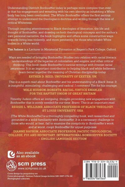 As we start to name an aspect of his existence which long remained unspoken, namely his engagement and wrestling with his own identity as inhabiting a white body, interpreting and understanding Dietrich Bonhoeffer today is perhaps more complex than ever. The White Bonhoeffer offers the first serious attempt to understand the theologian's doctrine and writing through the lens of critical whiteness. Through ongoing attentiveness to Black theologies of liberation, and the life and thought of Bonhoeffer, and drawing on both theological concepts and the author's own personal narrative, the book highlights and offers some constructive ways towards living less violently, and more penitently, for those who inhabit White bodies in a White world. Tim Judson's The White Bonhoeffer invites us into a postcolonial pilgrimage to consider whiteness and racism through a careful critique of Bonhoeffer's theology. It is a thoroughly compelling book, well researched and grounded in a solid familiarity with Bonhoeffer. But it is more than that. This book is a necessary challenge to those who would, at best, fail to examine the complicity in Bonhoeffer's work, and at worst, co-opt Bonhoeffer for unjust purposes. Judson's nuanced treatment of Bonhoeffer is both welcome and timely and is highly recommended. It encourages each of us in our own journeys out of whiteness (in its vast array of forms and effects) and toward social justice and community. Judson skillfully does this whilst honouring the legacy of the greatest theologian of the twentieth century, who, even eighty years after his death, prompts us to ask who Christ is for us, here and now.Di Rayson, Associate Professor, Theology and Ethics Pacific Theological College, Fiji,