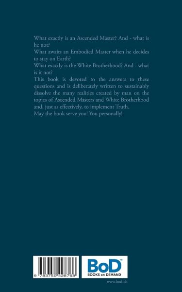 What exactly is an Ascended Master? And - what is he not?What awaits an Embodied Master when he decides to stay on Earth?What exactly is the White Brotherhood? And - what is it not?This book is devoted to the answers to these questions and is deliberately written to sustainably dissolve the many realities created by man on the topics of Ascended Masters and White Brotherhood and, just as effectively, to implement Truth.May the book serve you! You personally!