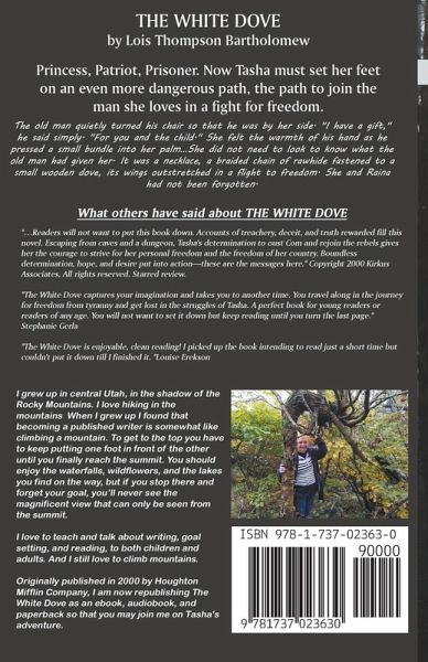 THE WHITE DOVE by Lois Thompson Bartholomew Princess, Patriot, Prisoner. Now Tasha must set her feet on an even more dangerous path, the path to join the man she loves in a fight for freedom. The old man quietly turned his chair so that he was by her side. "I have a gift," he said simply. "For you and the child." She felt the warmth of his hand as he pressed a small bundle into her palm…She did not need to look to know what the old man had given her. It was a necklace, a braided chain of rawhide fastened to a small wooden dove, its wings outstretched in a flight to freedom. She and Raina had not been forgotten. What others have said about THE WHITE DOVE "…Readers will not want to put this book down. Accounts of treachery, deceit, and truth rewarded fill this novel. Escaping from caves and a dungeon, Tasha's determination to oust Com and rejoin the rebels gives her the courage to strive for her personal freedom and the freedom of her country. Boundless determination, hope, and desire put into action-these are the messages here." Copyright 2000 Kirkus Associates, All rights reserved. Starred review. "The White Dove captures your imagination and takes you to another time. You travel along in the journey for freedom from tyranny and get lost in the struggles of Tasha. A perfect book for young readers or readers of any age. You will not want to set it down but keep reading until you turn the last page." Stephanie Gerla "The White Dove is enjoyable, clean reading! I picked up the book intending to read just a short time but couldn't put it down till I finished it. "Louise Erekson