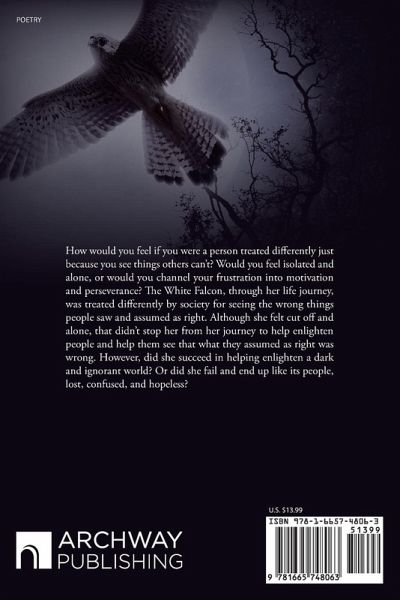 How would you feel if you were a person treated differently just because you see things others can't? Would you feel isolated and alone, or would you channel your frustration into motivation and perseverance? The White Falcon, through her life journey, was treated differently by society for seeing the wrong things people saw and assumed as right. Although she felt cut off and alone, that didn't stop her from her journey to help enlighten people and help them see that what they assumed as right was wrong. However, did she succeed in helping enlighten a dark and ignorant world? Or did she fail and end up like its people, lost, confused, and hopeless?