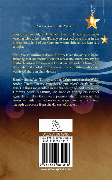 Do you believe in the Sleepers? Loving mother Myra Bradshaw does. In fact, she is always weaving tales to her son, Timmy, of mystical adventures in the Elysian field, land of the Sleepers, where children are kept safe at night. After Myra's untimely death, Timmy takes the story to heart, knowing that his mother, ferried across the River Styx by the mythic boatman Charon, will be safe in the land of Elysian, the place where the adult Sleepers tend to the children who have wandered there in their dreams. Shortly thereafter, Timmy and his father move to the Welsh border. There Timmy struggles to put Myra's death behind him. He finds some solace in the friendship of local boy Elliot. Timmy's belief in Elysian, and hope of finding his mother again there, takes them on a journey where they learn the power of faith over adversity, courage over fear, and how strength can come from the darkest of places.
