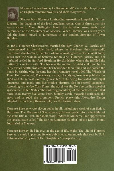 Florence Louisa Barclay (2 December 1862 – 10 March 1921) was an English romance novelist and short story writer. She was born Florence Louisa Charlesworth in Limpsfield, Surrey, England, the daughter of the local Anglican rector. One of three girls, she was a sister to Maud Ballington Booth, the Salvation Army leader and co-founder of the Volunteers of America. When Florence was seven years old, the family moved to Limehouse in the London Borough of Tower Hamlets. In 1881, Florence Charlesworth married the Rev. Charles W. Barclay and honeymooned in the Holy Land, where, in Shechem, they reportedly discovered Jacob's Well, the place where, according to the Gospel of St John, Jesus met the woman of Samaria (John 4-5). Florence Barclay and her husband settled in Hertford Heath, in Hertfordshire, where she fulfilled the duties of a rector's wife. She became the mother of eight children. In her early forties health problems left her bedridden for a time and she passed the hours by writing what became her first romance novel titled The Wheels of Time. Her next novel, The Rosary, a story of undying love, was published in 1909 and its success eventually resulted in its being translated into eight languages and made into five motion pictures, also in several languages. According to the New York Times, the novel was the No.1 bestselling novel of 1910 in the United States. The enduring popularity of the book was such that more than twenty-five years later, Sunday Circle magazine serialized the story and in 1926 the prominent French playwright Alexandre Bisson adapted the book as a three-act play for the Parisian stage. Florence Barclay wrote eleven books in all, including a work of non-fiction. Her novel The Mistress of Shenstone (1910) was made into a silent film of the same title in 1921. Her short story Under the Mulberry Tree appeared in the special issue called "The Spring Romance Number" of the Ladies Home Journal of 11 May 1911. Florence Barclay died in 1921 at the age of fifty-eight. The Life of Florence Barclay: a study in personality was published anonymously that year by G. P. Putnam's Sons "by one of Her Daughters." (wikipedia.org)