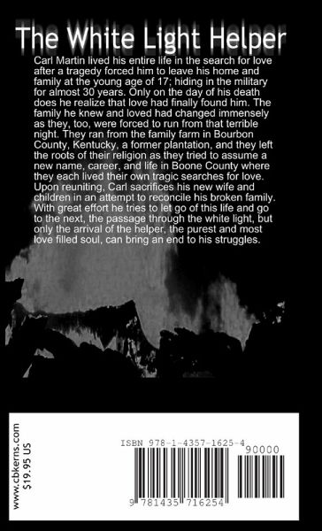 Carl Martin lived his entire life in the search for love after a tragedy forced him to leave his home and family at the young age of 17; hiding in the military for almost 30 years. Only on the day of his death does he realize that love had finally found him. The family he knew and loved had changed immensely as they, too, were forced to run from that terrible night. They ran from the family farm in Bourbon County, Kentucky, a former plantation, and they left the roots of their religion as they tried to assume a new name, career, and life in Boone County where they each lived their own tragic searches for love. Upon reuniting, Carl sacrifices his new wife and children in an attempt to reconcile his broken family. With great effort he tries to let go of this life and go to the next, the passage through the white light, and only the arrival of the helper, the purest and most love filled soul, can bring an end to his struggles.