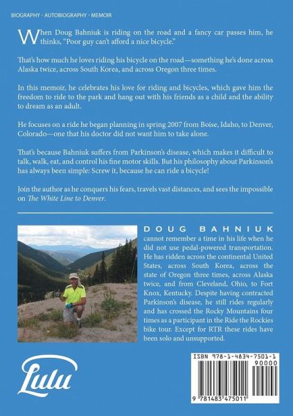 When Doug Bahniuk is riding on the road and a fancy car passes him, he thinks, "Poor guy can't afford a nice bicycle." That's how much he loves riding his bicycle on the road-something he's done across Alaska twice, across South Korea, and across Oregon three times. In this memoir, he celebrates his love for riding and bicycles, which gave him the freedom to ride to the park and hang out with his friends as a child and the ability to dream as an adult. He focuses on a ride he began planning in spring 2007 from Boise, Idaho, to Denver, Colorado-one that his doctor did not want him to take alone. That's because Bahniuk suffers from Parkinson's disease, which makes it difficult to talk, walk, eat, and control his fine motor skills. But his philosophy about Parkinson's has always been simple: Screw it, because he can ride a bicycle! Join the author as he conquers his fears, travels vast distances, and sees the impossible on The White Line to Denver.