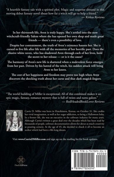 In her thirteenth life, Aven has settled into the now witchcraft-friendly Salem where she has found true happiness and friendship, maybe even love. Despite her contentment, the truth of Aven's existence haunts her. When she dies, her Spirit is forced from the Veil to live again in the body of a stranger. Does the elusive white raven, who has shadowed Aven through each of her lives, hold the secret to her release--or is it the cause? To make matters worse, an unrelenting, twisted evil lurks closely behind her. Sustained by his hatred of the witch, he won't give up until she's paid for what she did to him. When the truth of Aven's connection to the white raven is revealed, it is more horrifying than she could ever have imagined. Her freedom will come at a terrible price. And even then, will she truly be free? Emotional and gripping, this captivating debut novel is filled with vivid imagery carrying you on a roller coaster journey of suspense, tears, anger, and laughter. ---------- "Magic and suspense abound in this moving debut fantasy novel about how far a witch will go to help a friend. A heartfelt fantasy tale with a spirited plot." - Kirkus Reviews "It is always fun to find a new magic to read about. You think the genre is overdone until you find something bright and fresh like this." - FangirlNation.com ---------- - Bronze Medalist in the Fantasy category, 2019 Independent Publisher Book (IPPY) Awards - Winner of the Cross-Genre category, 12th Annual National Indie Excellence® Awards (NIEA) - Solo Medalist Winner in the Fantasy category, 2018 New Apple Summer eBook Awards - Finalist in the "Outstanding First Novel" category in the 2017 IAN Book of the Year Awards