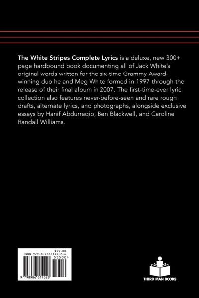 The White Stripes Complete Lyrics is a deluxe new 300+ page hardbound book documenting all of Jack White’s original words written for the 6x Grammy Award-winning duo he and Meg White formed in 1997 through the release of their final album in 2007. The first-time-ever lyric collection also features never-before-seen and rare rough drafts, alternate lyrics, and photographs, alongside exclusive essays by Hanif Abdurraqib, Ben Blackwell, and Caroline Randall Williams.