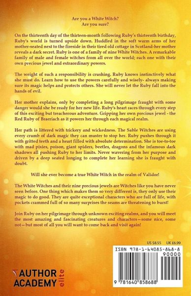 On the thirteenth day of the thirteen-month following Ruby’s thirteenth birthday, Ruby's world is turned upside down. Huddled in the soft warm arms of her mother-seated next to the fireside in their tired old cottage in Scotland-her mother reveals a dark secret. Ruby is one of a family of nine White Witches. A remarkable family of male and female witches from all over the world; each one with their own precious jewel and extraordinary powers. The weight of such a responsibility is crushing. Ruby knows instinctively what she must do. Learn how to use the powers carefully and wisely- always making sure its magic helps and protects others. She will never let the Ruby fall into the hands of evil. Her mother explains, only by completing a long pilgrimage fraught with some danger would she be ready for her new life. Ruby's heart races through every step of this exciting but treacherous adventure. Gripping her own precious jewel - the Red Ruby of Braeriach as it powers her through each magical realm. Her path is littered with trickery and wickedness. The Sable Witches are using every crumb of dark magic they can muster to stop her. Ruby pushes through it with gritted teeth and a heart filled with absolute determination. She is toe-to-toe with mad pixies, poison, giant spiders, beetles, dragons and the infamous dark shadows all pushing Ruby to her limits. Never wavering from her purpose and driven by a deep seated longing to complete her learning she is fraught with doubt. Will she ever become a true White Witch in the realm of Validor! The White Witches and their nine precious jewels are Witches like you have never seen before. One thing which makes them so very different is, they only use their magic to do good. They are quite exceptional characters who are full of life, with pockets crammed full of so many surprises the seams are threatening to burst! Join Ruby on her pilgrimage through unknown exciting realms, and you will meet the most amazing and fascinating creatures and characters—some nice, some not—but most of all you will want to come back and visit again!