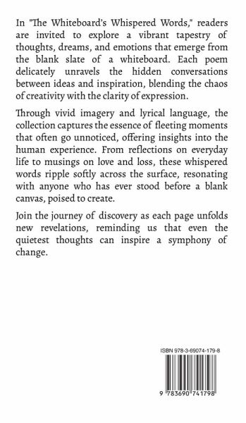 In "The Whiteboard's Whispered Words," readers are invited to explore a vibrant tapestry of thoughts, dreams, and emotions that emerge from the blank slate of a whiteboard. Each poem delicately unravels the hidden conversations between ideas and inspiration, blending the chaos of creativity with the clarity of expression. Through vivid imagery and lyrical language, the collection captures the essence of fleeting moments that often go unnoticed, offering insights into the human experience. From reflections on everyday life to musings on love and loss, these whispered words ripple softly across the surface, resonating with anyone who has ever stood before a blank canvas, poised to create. Join the journey of discovery as each page unfolds new revelations, reminding us that even the quietest thoughts can inspire a symphony of change.
