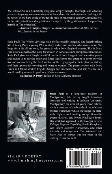 "Radical empathy," Jeanie Thompson, author of The Myth of Water, a book of poems written through the persona of Helen Keller, describes the process of work like her own. "Historical persona poetry" is not new, but especially significant in an age in which experts decry the lack of fellow feeling among us and its dark consequences. The Whited Air richly imagines and expresses what it would have felt like for a teenaged girl to leave her father and their farm on her own to join a legion of such girls working in Lowell, MA, at the textile mills, in more contemporary terms, finding oneself in a world utterly unfamiliar, a world that no longer feels like home. The protagonist Mary Paul, a real girl, is experiencing firsthand the great shift in 19th-century America from a rural world of home industry and barter to the economy and factories of the Industrial Revolution. She is working hard and long in a way almost beyond our ability to imagine. But that is the task of The Whited Air. And as exhausted as she is, she is still able to aspire to a more intellectual life, to spiritual fulfillment, even to living in a utopia. The fictional Irish mill girl, Brigid, counters and expresses anger at being invisible to girls like Mary though working alongside her, to the extreme bias the Irish faced upon immigrating here, the alien feeling of being a devout and Irish Catholic among Protestants, finally, a longing for the familiar. The original inspiration for this book is Andrew Hudgins' book about Sidney Lanier, After the Lost War, another group of deeply imagined poems about a historical figure. Mary Paul was not a poet like Lanier whose voice was heard in his own time. I hopeThe Whited Air ensures that her voice, as imagined, and representative of that of so many women, will now be heard.